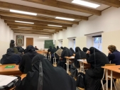 В этом году по благословению митрополита Тверского и Кашинского Саввы были открыты новые богословские курсы для монашествующих. Базой для подготовки насельниц женских монастырей епархии был выбран Свято-Екатерининский монастырь г. Твери. В группе обучающихся более тридцати насельниц, в их числе и сестры Ольгинского женского монастыря. Программа обучения обширная и длительная. Обучение началось в октябре и проводится ежемесячно краткими сессиями по 2-3 дня. В следующем году курс продолжится и завершится серьезным экзаменом. Но нам, кажется, уже не страшны никакие экзамены, если вспомнить о том, какие препятствия в буквальном смысле этого слова нам удалось преодолеть, чтобы попасть на курсы в первый день обучения. Было это 28 октября. Накануне по области пронесся ураган. Выехали мы из монастыря рано, в 6 утра, еще не рассвело. Через пару километров путь нам преградила поваленная ель, за ней в свете фар виднелась еще одна. Вызвали подмогу – монастырский священник иерей Алексей нехитрыми техническими средствами смог освободить проезд. Но «зеленый коридор» был коротким. Всего мы насчитали одиннадцать упавших деревьев на пути – и все они требовали более серьезного вмешательства: как минимум, в виде бензопилы, а лучше экипированной всем необходимым бригады МЧС. Расстроились, вернулись обратно. Но вскоре пришла радостная весть – путь свободен. Принесли ее археологи, ведущие в то время в деревне Волговерховье изыскательные работы на пути прокладки будущего газопровода. Они героически прорвались к месту работы, освободив путь и для остальных. Спаси Господи! Все нам удалось в этот день, хоть и с опозданием. Близлежащие деревни и монастырь тем временем оставались без электричества. И по возвращении еще пару дней мы молились, вели хозяйство и трапезничали при свечах. Следующие наши поездки в Тверь на курсы были вполне обычными. Программа обучения через месяц после начала получила высокую экспертную оценку выездной Межведомственной комиссии по вопросам образования монашествующих. Во встрече с членами комиссии 28 ноября приняла участие игуменья София. Архимандрит Феофилакт (Безукладников), возглавляющий комиссию, так разъяснил актуальность получения богословского образования для насельниц монастырей: знания, приобретенные на курсах, будут способствовать не только личному спасению, но и помощи в деле спасения ближних. Необходимость богословского образования для монашествующих важна и потому, что люди чаще всего с разрешением разнообразных духовных проблем обращаются именно в монастыри и не только к священнослужителям, но и к простым насельницам. Божией помощи вам, матушка София и сестры, на учебном послушании в следующем году, и Ангела-хранителя в дорогу! На фото: