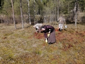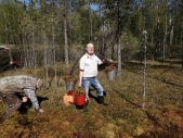 Сегодня в монастыре необычное послушание: занимаемся заготовкой мха на безымянном болоте. Рабочие рубят громадный сруб - будущую трапезную. Сруб состоит из венцов. Венец - это такая конструкция из брёвен, когда они укладываются прямоугольником в «колодец», а концы их скрепляются (зарубаются) друг с другом. Венцы укладываются один на другой и получается сруб нужной высоты. При укладке венцов между брёвен образуются небольшие пустоты. Они заполняются утеплителем. Мох считается лучшим природным утеплителем. Он не гниёт. Мох очень гигроскопичен, укладывают его между венцами влажным, даже специально поливают водой. Дома с таким материалом стоят сотни лет. Звено у нас небольшое, помогают Виталий и Юрий Сергеевич, живущий неподалёку. За старшую - игуменья София. Болотце мы нашли неплохое, таскать ведра недалеко – 70 м. Дёргать мох на первый взгляд просто. На самом деле - труд напряжённый и утомительный. Мох нужен красный и обязательно в мокром месте. Тогда он хорошо дёргается и чистый. Начали мы в 9 часов утра и к 12-ти часам заготовили тонну мха. Ровно столько грузоподъемность автомобиля. Виталий всё перетаскал на коромысле. Теперь можно укладывать первые венцы восстанавливаемой трапезной. Слава Богу.